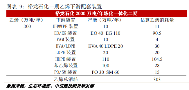 山东裕龙石化预计一期乙烯产能共300万吨,一期下游配套装置为聚烯烃、苯乙烯及EO/EG、EVA/LDPE等装置,VAM装置产物醋酸乙烯供EVA生产,UHMWPE装置产物超高分子量聚乙烯。下游配套装置种类的丰富,使得某一装置负荷改变后,其余多种装置可分担乙烯对的消耗。