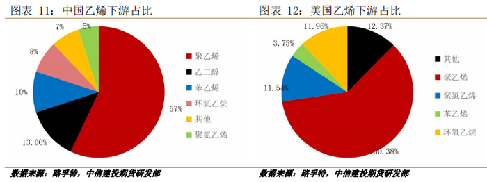 路孚特数据显示,当前中、美乙烯最主要下游均为聚乙烯占比近60%,中国其次为乙二醇、苯乙烯及环氧乙烷,占比分别在10%左右。美国则为聚氯乙烯及环氧乙烷,占比10%附近,用于生产苯乙烯的占比较低。
