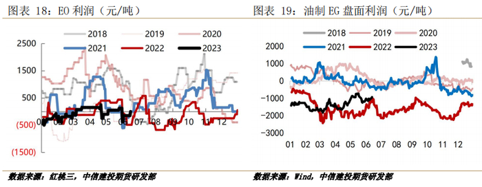 EO及EG过去五年来产能增速均处较高水平,产能利用率呈现下行态势,截至2022年EO产能利用率58%,EG产能利用率55%,均已处于产能过剩状态。二者利润自2022年以来压缩严重,并且多数时间处于亏损状态,绝对利润方面,EO表现略强于EG,2023年后EO新投产放缓,EG投产继续,未来联产装置尚可通过调节EG相EO转移略改善利润,但对于提高乙烯下游利润效果有限。