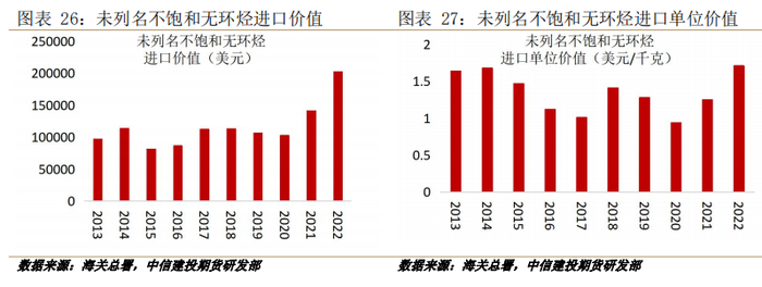 作为其中关键的原料α-烯烃及乙烯的下游之一(α-烯烃指在分子链端部具有双键的单烯烃,当前以1-己烯及1-辛烯较常应用),其技术壁垒较高,目前国内α-烯烃产能相对欠缺,主要通过进口来获得。根据海关总署数据,近十年来1-2己烯及1-辛稀所属的“未列名不饱和无环烃(29012990)”进口价值呈现波动上行趋势,近五年来年均进口总价值增速约16%,且单位进口价值保持较高水平。