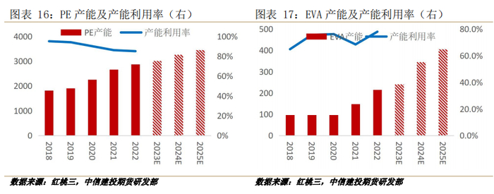 PE近五年来保持稳定增长,产能利用率虽逐步下滑,但2022年仍保持85%左右水平,预计到2025年年均产能增速5%-6%,未来三年暂不会出现明显供过于求现象。2022年油制成本高企,全年多处于亏损状态,2023年来多处在盈亏平衡状态,未来PE市场主流牌号价格维持低利润生产或成为常态。