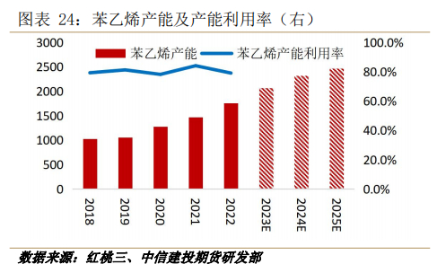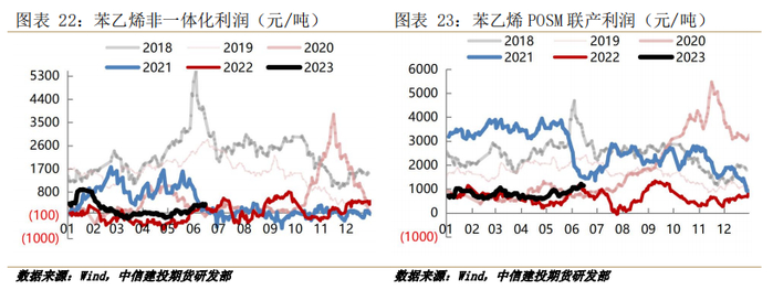 苯乙烯过去五年年均产能增速超12%,产能利用率80%附近,预计2023-2025年年均产能增速仍保持在10%水平,届时产能过剩局面将逐渐明显。非一体化工艺自2021年下半年来多数时间保持低利润或略亏损生产状态,POSM联产工艺尚存利润,后续随着新增产能的投放,非一体化利润或先一步压缩,POSM工艺利润压缩相对缓慢,但长期对于平衡乙烯及提高整体利润效果同样有限。