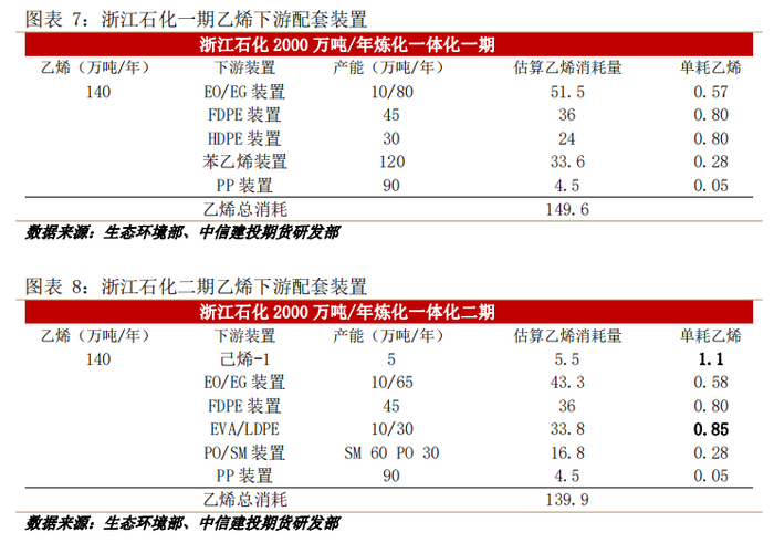 由于乙烯自身性质,其运输及储存条件较为苛刻,外运辐射范围有限。近些年精细化工行业发展,乙烯装置的投产通常有下游配套设备。参考几大炼厂生态环境部报告,我们对于乙烯再平衡进行梳理。从乙烯再平衡角度考虑,炼化一体化乙烯下游配套聚烯烃、EO、苯乙烯等,可以不同程度调节负荷,尤其是聚烯烃品种,对乙烯的单耗最高,调节作用更强,并且随着配套种类的丰富选择更广。