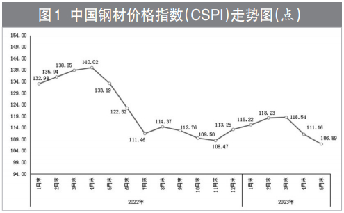 据中国钢铁工业协会监测,5月末,中国钢材价格指数(CSPI)为106.89点,环比下降4.27点,降幅为3.84%;比今年初下降8.33点,降幅为7.23%;同比下降26.30点,降幅为19.75%。