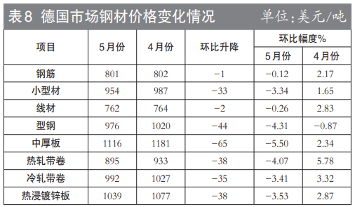 5月末,钢协监测的8大钢材品种价格均持续下降,其中高线、Ⅲ级钢筋、角钢、中厚板、热轧卷板、冷轧薄板、镀锌板和热轧无缝管价格分别环比下降174元/吨、170元/吨、313元/吨、229元/吨、252元/吨、143元/吨、93元/吨和214元/吨。