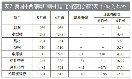 5月份,CRU北美钢材价格指数为295.5点,环比下降10.0点,降幅为3.3%,环比由升转降;美国制造业PMI(采购经理指数)为46.9%,环比下降0.2个百分点。5月末,美国粗钢产能利用率为77.2%,环比上升1.2个百分点。5月份,美国中西部钢厂长材价格保持稳定,板材价格稳中有降。