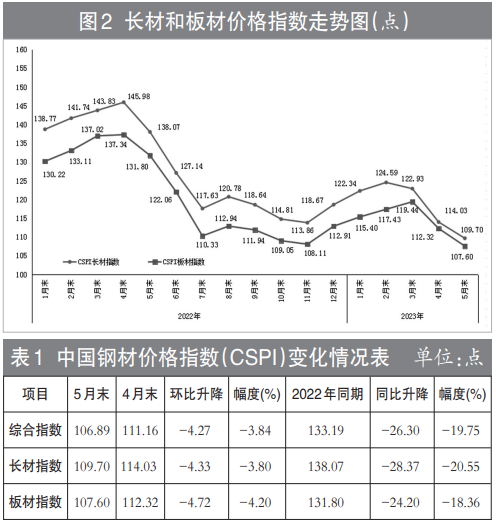 5月末,CSPI长材指数为109.70点,环比下降4.33点,降幅为3.80%,环比持续下降;CSPI板材指数为107.60点,环比下降4.72点,降幅为4.20%,板材降幅比长材高0.41个百分点。与上年同期相比,长材、板材指数分别下降28.37点和24.20点,降幅分别20.55%和18.36%。