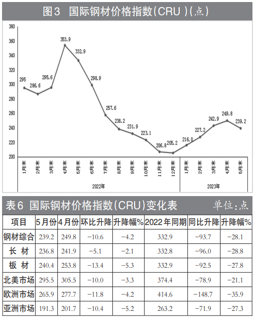 5月份,CRU国际钢材价格指数为239.2点,环比下降10.6点,降幅为4.2%,环比由升转降;同比下降93.7点,同比降幅为28.1%。