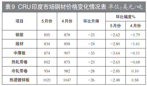 5月份,CRU亚洲钢材价格指数为191.3点,比4月份下降10.4点,降幅为5.2%,降幅较4月份扩大1.2个百分点。日本制造业PMI为50.6%,环比上升1.1个百分点;韩国制造业PMI为48.4%,环比上升0.3个百分点;印度制造业PMI为58.7%,环比上升1.5个百分点;中国制造业PMI为48.8%,环比下降0.4个百分点,降幅有所收窄。5月份印度市场钢材品种均持续下降。