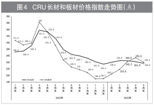 5月份,CRU长材指数为236.8点,环比下降5.1点,降幅为2.1%,降幅较4月份加大1.0个百分点;CRU板材指数为240.4点,环比下降13.4点,降幅为5.3%,降幅较4月份扩大10.1个百分点。与去年同期相比,CRU长材指数下降96.0点,降幅为28.8%;CRU板材指数下降92.5点,降幅为27.8%。