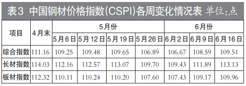 5月份,CSPI国内钢材综合指数呈波动下行走势。其中,第二周、第三周小幅回升,第四周由升转降。进入6月份以来,钢材价格第一周继续下行,第二周、第三周小幅上升。