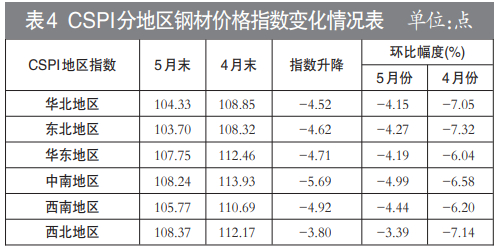 5 月份,CSPI 全国六大地区钢材价格指数均持续下降,降幅较 4 月份相比有所减小。其中,华北、东北、华东、中南、西南和西北地区钢价指数环比分别下降4.15%、4.27%、4.19%、4.99%、4.44%和3.39%。