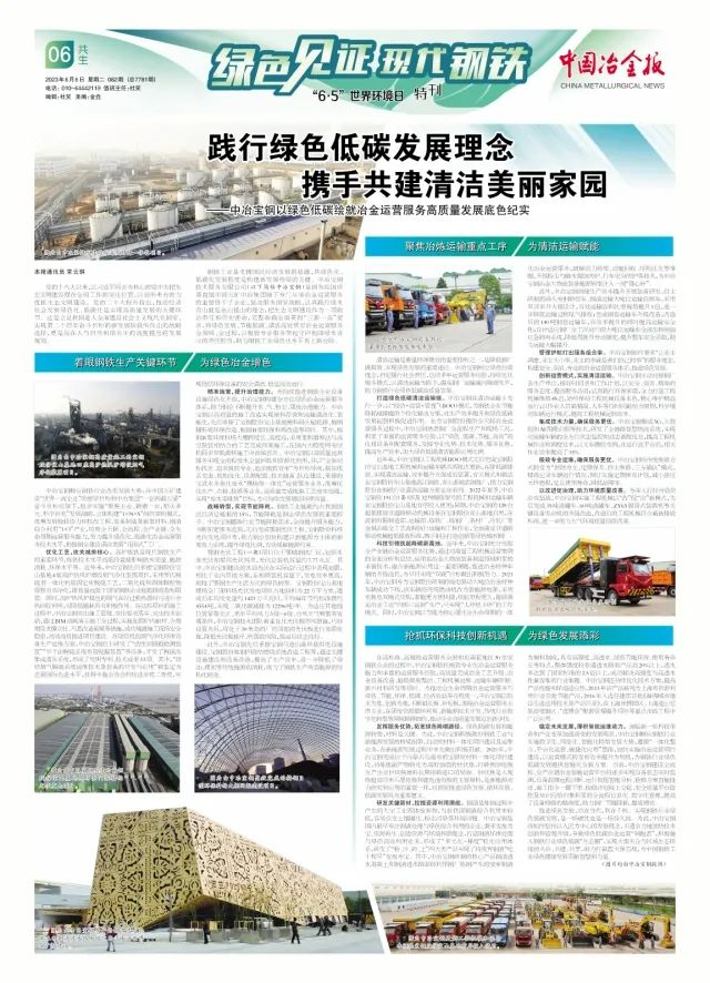 推进绿色发展,功在当代,利在千秋。实现钢铁行业绿色低碳发展,是一场硬仗也是一场持久战。为此,中冶宝钢将始终坚持以人民为中心的发展理念,不遗余力地加快技术创新和管理升级,争做绿色低碳冶金运营“领跑者”,积极融入钢铁行业绿色低碳“生态圈”,实现大型央企与区域生态环境的共治、共建、共享,助力打赢蓝天保卫战,为中国钢铁工业绿色健康发展贡献智慧和力量。