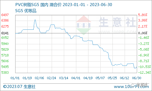 据生意社商品行情分析系统,2023年1-6月PVC行情下跌。1月1日国内PVC电石法SG5现货均价为6141.67元/吨,6月30日均价为5503.33元/吨,上半年内价格下跌,幅度为10.39%。