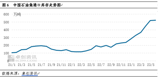 2023年上半年,港口库存整体处于增加趋势,此因素也直接反馈出石油焦的供应过剩和需求不足的问题。供需矛盾不断凸显,对石油焦价格影响较大。截至2023年6月底,全国港口石油焦库存达到525万吨,较2022年6月底增加169.23%。