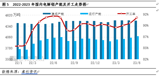 对于电解铝而言,上半年国内仍有大量产能待复产的地区是在西南地区,但西南地区受到水电供应紧张的影响,复产进度缓慢,对上游石油焦维持刚需支撑。其中云南地区更是深受电力供应困扰,今年亦出现连续多次减停产,前五个月基本未出现复产产能,对上游石油焦需求支撑有限。目前随着丰水期来临,云南地区来水出现好转,6月下旬云南地区复产落地,受近期行业利润良好带动,云南地区复产进度提速存增加预期,下半年对石油焦需求量有望增加。据卓创资讯监测数据显示,截至2023年6月底,国内铝冶炼企业建成产能4474.6万吨,运行产能4082.9万吨,因此产能运行率为92.25%,较去年同期上涨1.21%,传导至上游成本石油焦刚需采购支撑(如图5)。