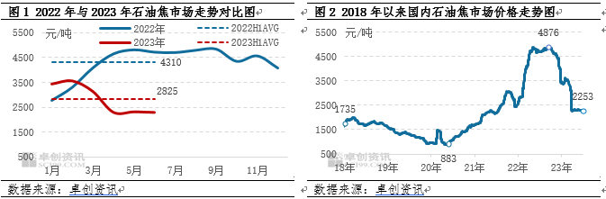 2023年上半年国内石油焦价格总体呈现弱势下行局面。1-2月石油焦价格经历短暂平稳后,3月下旬开启下行走势,并在3月底跌破2249元/吨。截止到2023年6月30日,国内石油焦价格为2253元/吨,较 2022 年末下跌1197元/吨,跌幅为35%;从相对水平来看,上半年均价为2825元/吨,较2022年上半年下跌1240元/吨,跌幅30.5%。上半年石油焦市场具体走势变化如下: