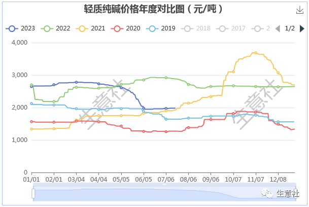 从纯碱的年度价格对比图可以看出,纯碱价格最高位出现在2021年11月份左右,2023年上半年整体高开低走。