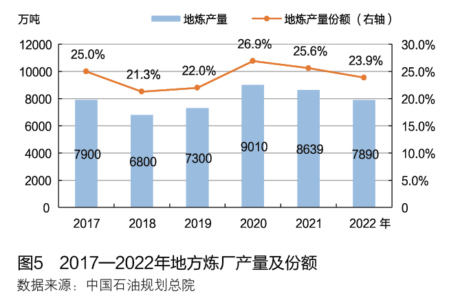 2022年,相关管理部门继续加强非国营贸易的进口原油配额的管理,对地方炼厂的进口配额原油流向、成品油消费税缴纳情况以及环保达标情况进行了多轮核查。治理整顿后,地方炼厂汽柴油产品的缴税比例已从50%提高到70%,市场总体的规范性增强,正常使用进口配额原油的地方炼厂减少到30家。截至2022年底,中国地方炼厂炼油总能力达到2.18亿吨/年,2022年地方炼厂的常减压装置平均开工率只有62%,较上年下降7.2个百分点,原料加工量与上年相比下降5.8%。其中,恒力石化、浙江石化、盛虹石化3家企业的炼油能力占地方炼厂总能力的35%,炼化一体化企业的汽柴油收率明显低于传统地方炼厂,2022年地方炼厂的汽柴油产量与上年相比下降9.3%,在全国产量中的份额下降1.7个百分点。2017—2022年地方炼厂产量及份额变化见图5。