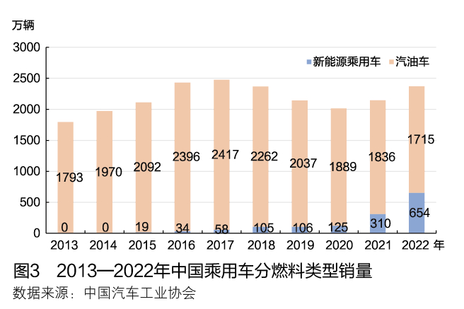 新能源车快速发展,分流了汽油车销量。2017年以来汽油车销量持续下降,2022年销量仅为2017年的69%。2022年新能源乘用车销量超过650万辆,增速为96%,在乘用车市场中的销量渗透率达到28%。汽油车新车销量下降,汽油消费增长缺乏内在动力。2013—2022年中国乘用车分燃料类型销量见图3。