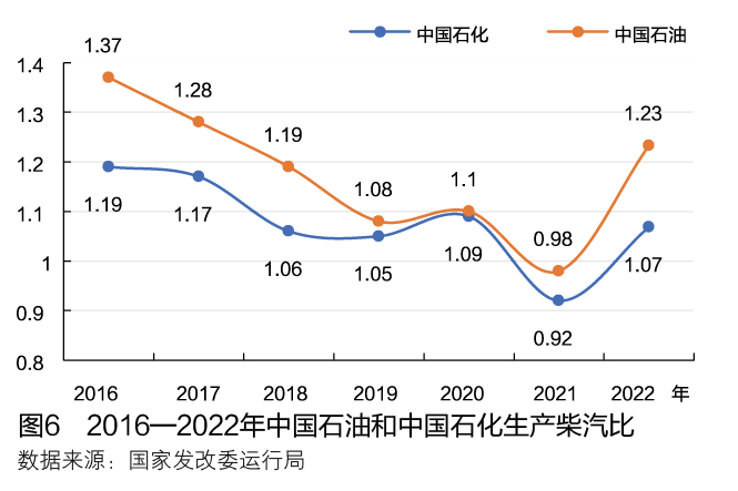 中国石化和中国石油的成品油产量依旧保持主导地位,占国内总量的68%。在“减油增化”(炼油厂减少成品油产量,增加化工品产量)政策主导下,两大集团汽柴油收率呈持续下降状态。2021年,中国石化和中国石油的汽柴油收率分别较2017年下降2.7个百分点和2.5个百分点。2022年,受需求侧柴汽比大幅提高及柴油供应偏紧影响,两大集团的柴油收率显著回升,生产柴汽比也摆脱持续下行趋势而大幅回升,均回升到1.0以上的水平。两大集团生产柴汽比变化见图6。