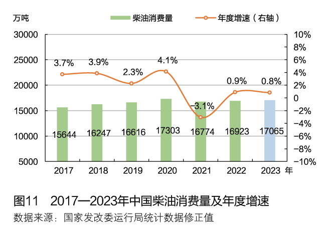 LNG对柴油的替代量将回升。2022年,国际油气价格飙升,但北半球取暖季过后,LNG价格开始持续下跌,中国到岸LNG价格已跌回乌克兰危机爆发前的水平,但国际油价依然高位震荡。与柴油比较,车用LNG成本优势明显,尤其是中国西北和华北等国产天然气较为丰富的地区,LNG的价格优势更为突出。预计2023年公路运输领域LNG对柴油的替代量将回升,公路物流领域柴油增长有限。综合对生产行业和运输行业需求的柴油的分析,预计2023年中国柴油消费量为1.7亿吨,比上年增长0.8%;消费柴汽比为1.07,重回2015年以来的下降趋势。2017年以来中国柴油消费量及年度增速变化见图11。