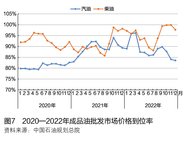 2022年原油价格飙升、突发疫情、清理整顿等因素使得供给端难以把握市场节奏,虽然全年的成品油供应量仍大于资源量,但阶段性供需错配频发,致使2022年秋冬季再次出现柴油供应紧张情况。由于国家现阶段对成品油销售仍实施最高限价管理,因此成品油销售企业批发价格与国家发改委指导价相比,得到的批发环节价格到位率,可以较好地反映市场供需关系的变化。国家发改委指导价是销售企业批发价格的天花板,因此价格到位率越接近100%,说明市场的供应情况越紧张。以中国石油销售公司的批发价格到位率为例,上半年汽柴油价格均呈现“高开低走”模式,主要原因是第二季度东部地区大面积疫情造成消费萎靡,加之成品油出口配额下发数量下降,国内资源过剩严重,成品油库存高企,价格持续下降。下半年,汽油价格到位率在第三季度略有回升,但秋冬疫情再次来袭,汽油消费再次受到重创,价格到位率重回下降通道。柴油价格却在第四季度走出一波上扬行情,主要原因是秋冬季节为用电高峰、优质煤炭产能大量释放,柴油需求激增。从全年均值看,汽油价格到位率为88.5%,较上年下降0.8个百分点;柴油价格到位率为95.4%,较上年提高4.4个百分点,是疫情发生以来最高水平。2020—2022年批发市场汽柴油价格到位率变化见图7。