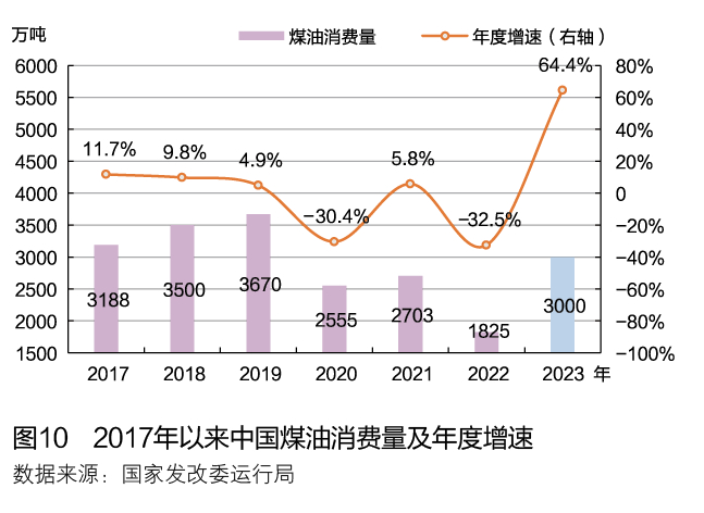 航煤是成品油3个品种中受疫情影响最明显的油品,消费量随疫情变化大起大落。过去10年,亚太地区是拉动全球航煤需求增长的最主要力量。国际航空运输协会(IATA)预计2023年全球航空客运将全面恢复,亚洲航空市场在中国疫情管控措施调整后将加速复苏。疫情对国际航线运输影响较大。由于国内外疫情后恢复状态不同,中国国内航线和国际航线航空运输恢复速度表现出明显差异。2023年公商务航空出行先于私人恢复,国内航线恢复程度好于国际航线。预计2023年航煤消费量为3000万吨,恢复至2019年的82%左右,较2022年增长64%。近年来中国煤油消费量及年度增速变化见图10。