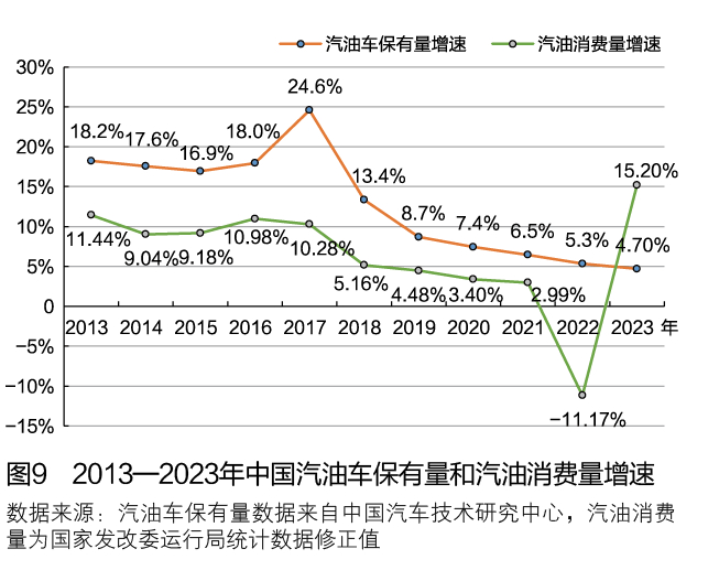 随着防疫政策的调整,涉疫地区大面积封控的情况难以再现,乘用车出行频率将大幅回升,存量汽车的消费潜力将充分显现。国家及各地政府多次发文,强调继续促进汽车的消费。2023年,中国汽油车保有量仍将保持5%左右的增长,汽车保有量的持续增长给汽油消费增长带来了坚实基础。与2019年相比,预计2023年中国汽油车保有量将增加26%,参考疫情前10年中国汽油车保有量和汽油消费量之间的量化关联,并考虑高油价背景下居民汽油消费能力下降,预计2023年中国汽油消费量为1.59亿吨,较2019年增长9%,较2022年增长15.2%。近年来中国汽车保有量增速和汽油消费量增速变化见图9。
