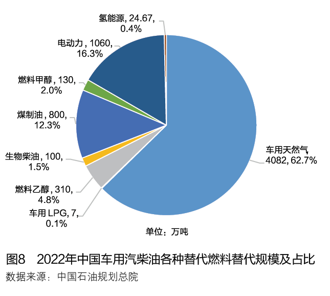 综上所述,2022年各种替代能源替代常规汽柴油约6514万吨,比上年增长0.8%,增量主要来自电动力、氢能源和煤基液体燃料,减量主要来自车用天然气和LPG。2022年中国各种替代燃料替代规模及占比见图8。