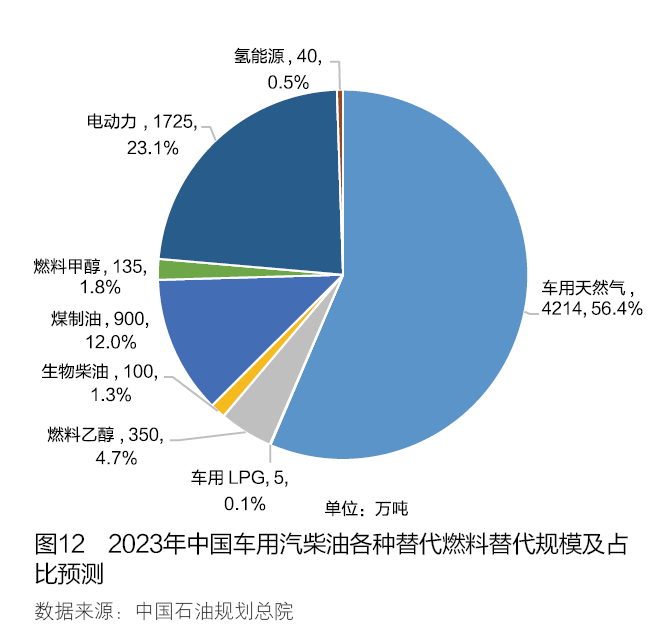 综上所述,预计2023年各种替代能源替代汽柴油约7469万吨,比上年增长14.7%,除LPG外替代量均呈增长态势,增长较为突出的是电动力、煤制油和车用LNG。2023年中国各种替代燃料替代规模及占比预测如图12所示。