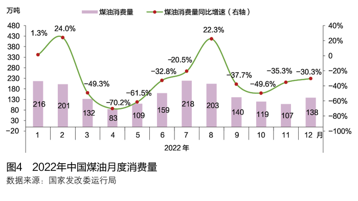中国煤油消费中,97%以上为航煤,因此在消费研究中,常以航煤研究代替煤油。在航空行业“动态清零”的防疫政策下,多条国际航班“熔断”,国内航班大面积取消也成为常态。2022年二季度和秋冬疫情严峻时,每日航班数减少至3000~4000班,仅为2019年水平的1/3。2022年中国煤油消费量为1825万吨,与上年相比下降超过30%,消费规模仅为2019年的50%。从月度变化看,2月与3月之间、8月与9月之间消费量的同比增速变化超过60个百分点,煤油消费月度波动起伏剧烈。2022年中国煤油分月消费量变化见图4。