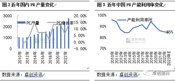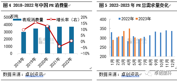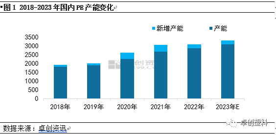 国内PE产能持续增加,国内PE供应量也呈现持续增加趋势。据卓创资讯数据统计,2023年1-6月国内PE累计产量1327.58万吨,较去年累计同比增加10%。