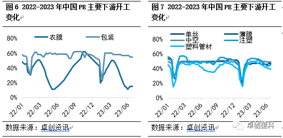 农膜方面,农膜属于农用物资,刚性需求为主且具有明显的淡旺季,2023年上半年开工率不及2022年上半年,平均开工率同比下滑2%左右,除不可抗因素的影响,也受到企业利润不佳及农户换膜频次减少的影响;包装方面,受经济环境影响相对较大,2023年上半年开工率较去年同比下滑3%左右。目前,多数HDPE行业开工率维持在40%-50%区间运行。