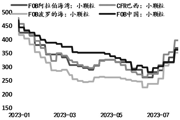 近两个月的时间,国际部分地区尿素价格累计上涨超150美元/吨。从颗粒度来说,由于国际市场上大颗粒尿素的需求相对更为集中,因此大颗粒尿素价格上涨更多。在大颗粒尿素价格的带动下,小颗粒尿素价格也大幅上涨,但整体涨幅相对缓和,阿拉伯海湾小颗粒尿素价格由6月初的290美元/吨上涨至370美元/吨,波罗的海小颗粒尿素FOB价由6月初的250美元/吨上涨至352美元/吨,小颗粒尿素涨幅为80—102美元/吨,涨幅明显小于大颗粒尿素。另外,近期埃及三家尿素生产商因出口许可证问题,被要求停止提供尿素出口。印标的发布对国际尿素价格的推涨有至关重要的作用,印度IPL发布的新一轮不定量大小颗粒尿素招标于8月9日截标,因此在印标具体的价格及招标量公布之前,国际市场仍然存在较大的炒作空间。