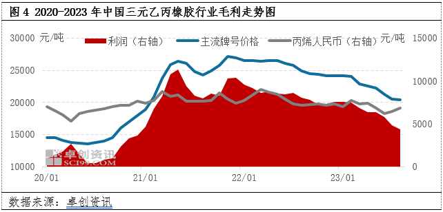 通过卓创资讯监测中国三元乙丙橡胶行业毛利走势可以看到,在2020年1月-2023年8月,三元乙丙橡胶行业毛利表现出低位-大幅走高-回归理性的不同阶段表现。其中2020年12月可以作为一个时间节点,三元乙丙橡胶反倾销政策的执行,对于产品行业供需结构产生了重要影响,在货源紧张的阶段下,三元乙丙橡胶行业,毛利短期出现了明显的走高表现。后续阶段,政策影响于行业内逐步消化,产品毛利水平逐步回归至合理状态。就三元乙丙橡胶行业毛利水平同原材料的关系来看,原料价格波动对于三元乙丙橡胶存在一定影响,两者大体趋势存在一致性。但就影响程度来看,原材料价格波动对于三元乙丙橡胶影响程度并不十分重。