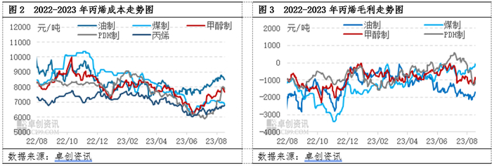 首先就原材料方面,以卓创资讯监测丙烯成本及毛利走势数据为参考。可以发现,2022年8月-2023年8月,国内丙烯成本处于震荡走弱的状态,2023年6月处于成本低点,于后面开始反弹;就国产丙烯毛利来看,2022年8月-2023年8月这段周期内,基本处于亏损状态,产品亏损程度偏重。