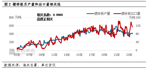 截止到7月份,卓创资讯研究2005年1月至今的镀锌板月产量和出口量数据,进行相关性分析发现相关系数在0.8969,属于高度正相关。在镀锌板的产量体系中,出口量是作为供应数据出现的,更多反映了我国资源流向国际市场的进度,对于总供应量形成一定的消化。