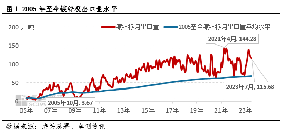 备注:2005至今镀锌板出口量平均水平选取2005年1月至今镀锌板出口量的连续算术平均值。