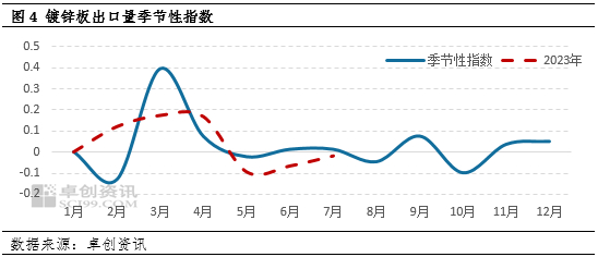 卓创资讯通过近18年镀锌板出口量的季节性数据作图,从中可以发现2023年2、4月的走势明显高于季节性指数,3、5、6、7月份的走势明显低于季节性指数,振幅略有收窄,上半年的表现来看趋势除2、6、7月份之外月份基本符合近18年的季节性表现。