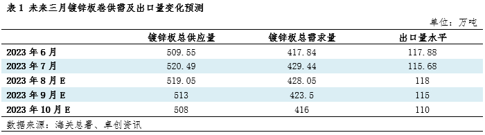 通过对比分析镀锌板出口量数据的位置来看,2023年前7个月镀锌板出口量多数时间高于平均值水平,其中2月份高于高值水平。同时通过趋势表现来看,未来半年的出口量大概率仍有可能有超过4月份的水平出现,整体呈现先强后弱的态势。具体预测数据可参见表1。