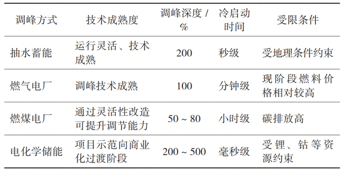 天然气与风能、太阳能的融合主要是天然气发电参与风电、光伏发电调峰。在构建新型能源体系过程中,电力系统灵活调节能力对于支撑高比例新能源并网、提高大电网运行安全性和可靠性至关重要[6]。灵活性资源主要包括煤电灵活性改造、燃气机组、抽水蓄能和电化学储能。其中:抽水蓄能是较好的调峰方式,但受制于地理条件,发展空间受限;电化学储能大规模应用尚需时日,且发展上限需考虑锂、钴、镍等资源约束;相较燃煤发电,燃气发电调峰技术成熟,碳排放强度约为燃煤发电的50%,且负荷调节范围宽、响应快速,是未来较好的调峰选择。各类灵活性资源对比见表1。