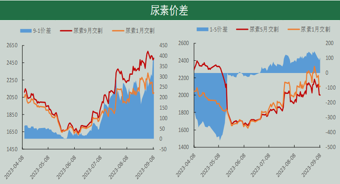 中农假期发布通知,表示要减少尿素出口,反对囤积居奇以及抑制投机,加上市场对于法检预期从严,尽管印度发布新一轮招标,但市场对此反应有限,上周初,期价跳空低开后低走,特别是中农再发通知表示要将现有库存全面向市场投放,并延迟冬季尿素淡季储备采购计划,市场情绪进一步趋弱,周四扩大回调幅度,重心显著下移;不过,现价受到现有订单支撑而降价缓慢,基差再度逆势扩大,周五期价并未继续下挫,低位震荡小幅收阳。截止到9月8日,尿素2401合约报收于2103元/吨,较9月1日结算价下调253元/吨,跌幅10.73%,振幅9.39%。
