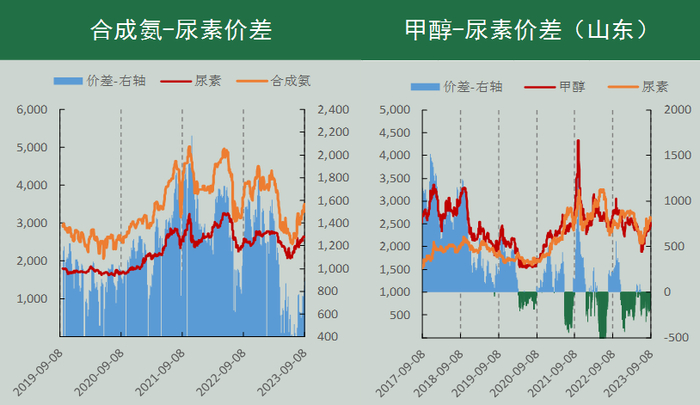 上周,合成氨价格延续强势运行,截止到9月8日,山东地区合成氨价格3510元/吨,较9月1日上调190元/吨,尿素价格涨幅放缓,周环比虽有上调,涨幅不及合成氨,合成氨与尿素价差略有扩大,截止到9月8日,本周合成氨尿素价差890元/吨,环比走扩,但同比仍处于相对偏低水平。甲醇现货价格震荡回落,截止到9月7日,甲醇市场价格2445元/吨,较9月1日下调90元/吨,甲醇与尿素价差周环比走弱,山东地区现货甲醇与尿素价差-185元/吨,同比仍处于近几年同期偏低水平。甲醇需求旺季即将到来,加上原油价格表现偏强,甲醇与尿素价差后续或有扩大,可以适当考虑跨品种套利。