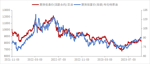 (一)宏观:从大环境来看,在国内稳增长及政策不断加码,国际方面美联储加息或临近尾声,市场对经济衰退的担忧缓和,大宗商品下行压力转弱,但新的周期开始仍待进一步观望。国际油价偏强运行,也对油脂构成支撑。沙特和俄罗斯将各自的自愿减少供应量延长到今年年底,美国原油增产预计有限,长期存在生产瓶颈。而需求端,国内外来看全球原油需求仍保持增长态势,因此国际油价预计四季度维持高位运行。