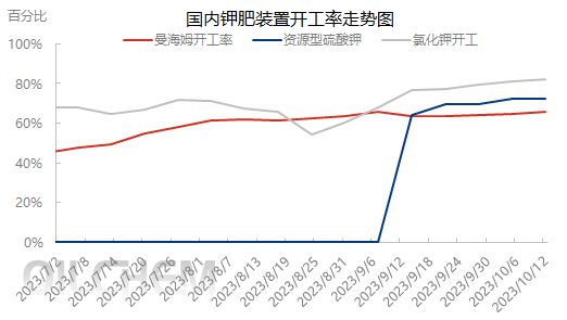 目前国内钾肥厂家的装置开工率均处于相对高水平的状态,氯化钾厂家在三季度开工略有下行,但进入9月份之后,装置开工率不断恢复,计划在9-10月份氯化钾的全国开工率将达到8成以上的水平。但随着天气的转冷,以及天然气等资源的冬季短缺,后续氯化钾的装置开工率将陆续减少,且高品质货源供应将略有紧张。