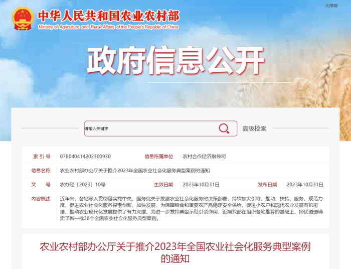 农业农村部办公厅关于推介2023年全国农业社会化服务典型案例的通知