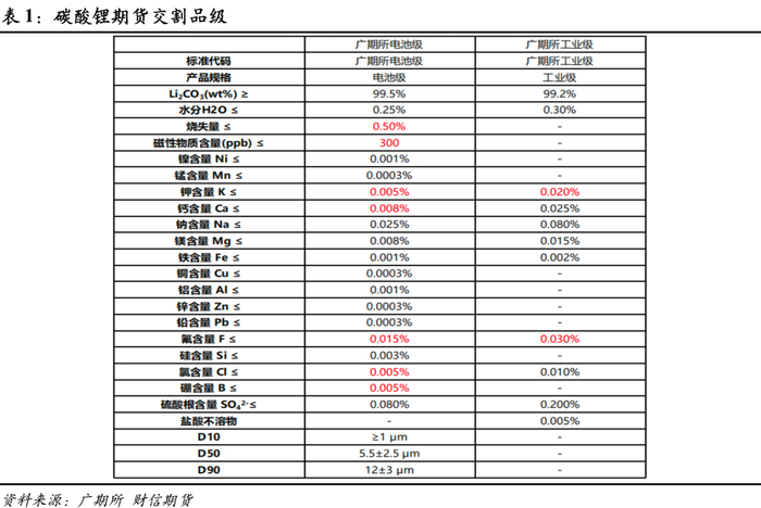 关于大家最为关注的交割标准问题,广期所在碳酸锂期货上市时就公布了交割品级,此次培训公布的交割品级与之前保持一致。设置基准交割品和替代交割品,基准交割品为电池级碳酸锂,要求符合《中华人民共和国有色金属行业标准电池级碳酸锂》(YS/T 582-2013)标准,其中收紧磁性物质含量,放宽钾、钙、氯含量,新增烧失量、硼、氟含量指标。替代交割品为工业级碳酸锂,设置了25000元/吨的替代交割品贴水。替代交割品要求符合《中华人民共和国国家标准碳酸锂》(GB/T 11075-2013)0级碳酸锂的标准,其中Li2CO3≥99.2%,新增钾、氟含量指标,粒径不作要求,规则为保持标准统一引用了YS/T 582-2013,但指标要求是工业级碳酸锂。
