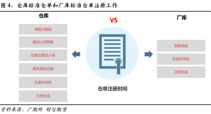 仓库标准仓单和厂库标准仓单注册区别较大。仓库标准仓单注册要做预报、入库、检测、审批等流程。而厂库更多的是信用仓单,厂库仓单注册不要求厂库必须有相应的实物,而是要求厂库的主体每天按照交易所的规定为买方客户进行发货,因此相对简单,只需要出具银行保函,交易所就会按照要求进行仓单的注册审批。且仓库货物入库都需要质检,而厂库货物是不需质检,只需在出库的时候对货物进行留样便可。