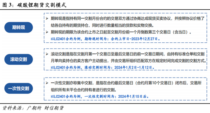 广期所碳酸锂期货适应的交割模式有三种,分别是:期转现、滚动交割和一次性交割。